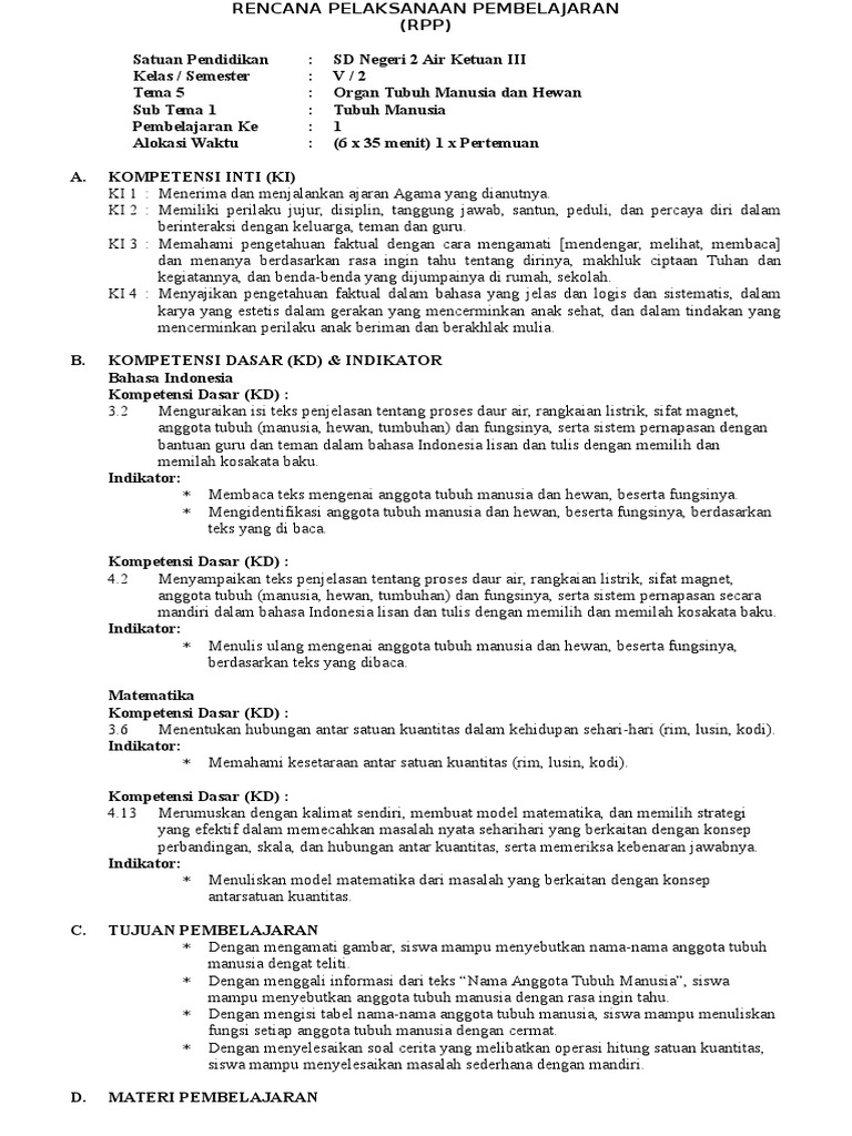 Rpp Sd Kelas 5 Semester 2 Organ Tubuh Manusia Dan Hewan