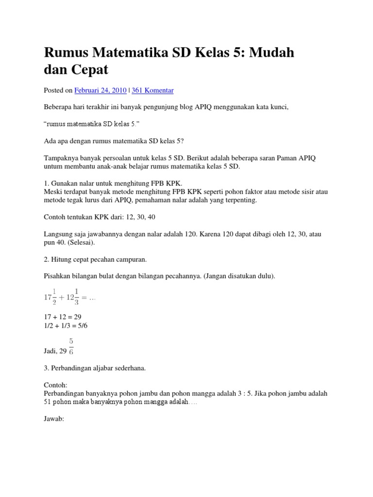 Rumus Matematika Sd Kelas 5 Mudah Dan Cepat Anak Kreatif