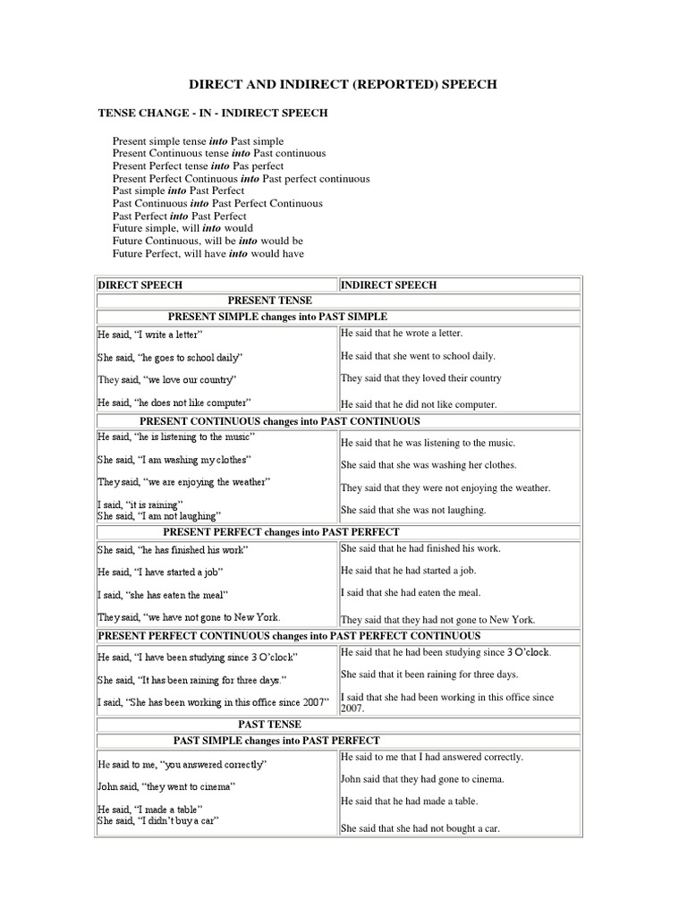 Reported Direct Indirect Speech Docx Question Perfect Grammar