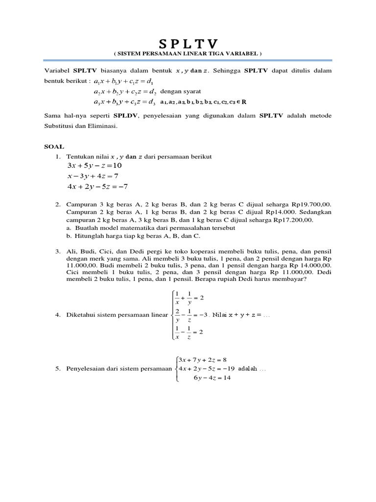 Sistem Persamaan Linear Tiga Variabel Dan Contoh Soal Penerapannya