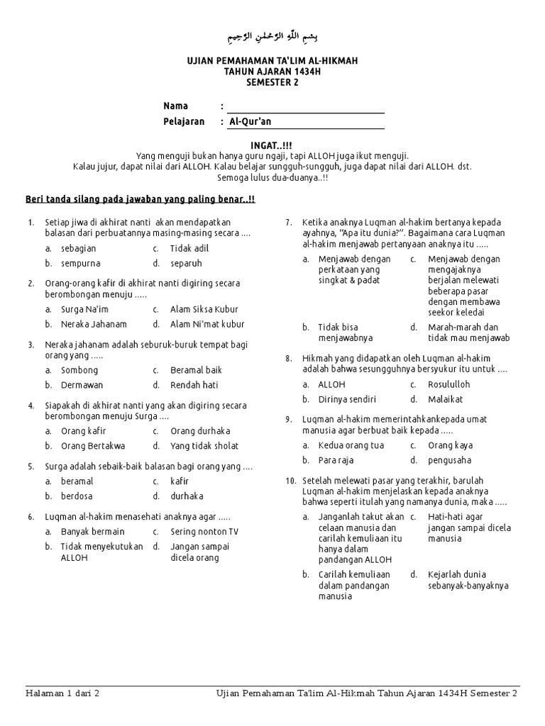 Soal Dan Kunci Jawaban Ujian Akhir Talim Al Hikmah Semester Ii Tahun