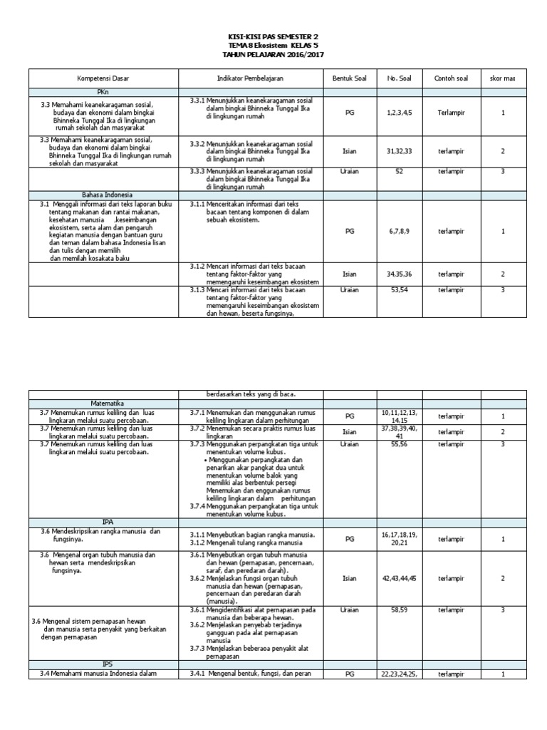 Kisi Kisi Soal Uh Pts Pas Kelas 5 Sd Mi Semester 2 K13 Revisi 2017