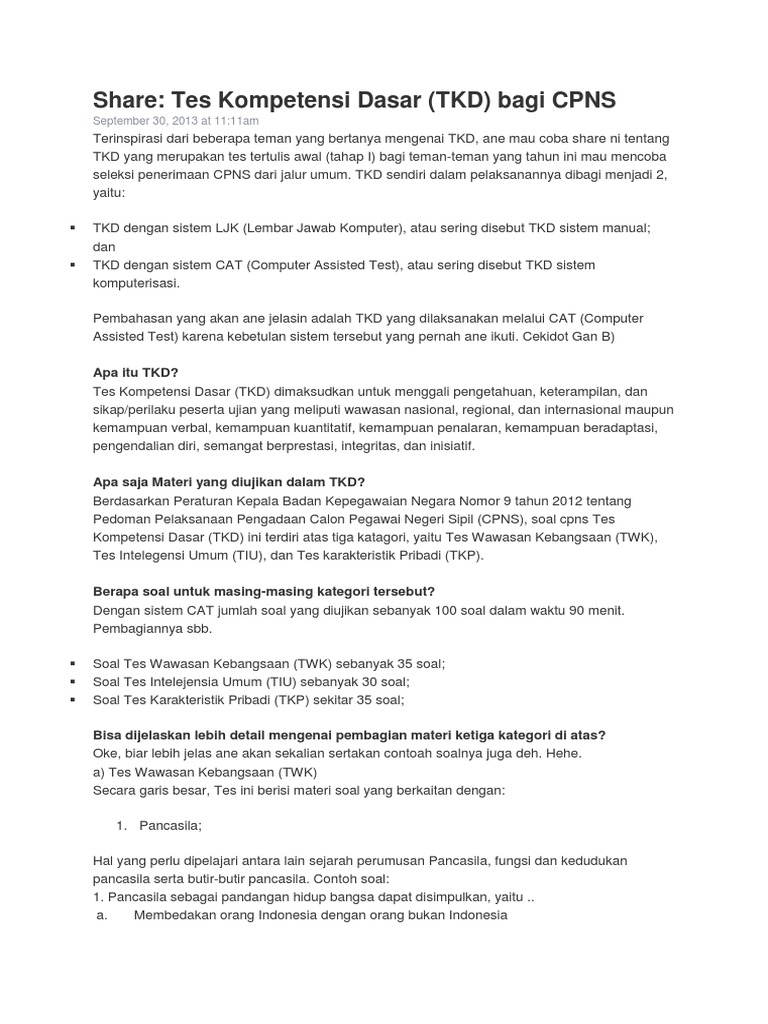 100 Contoh Soal Cpns Tes Kompetensi Dasar Tkd Dan Pembahasannya