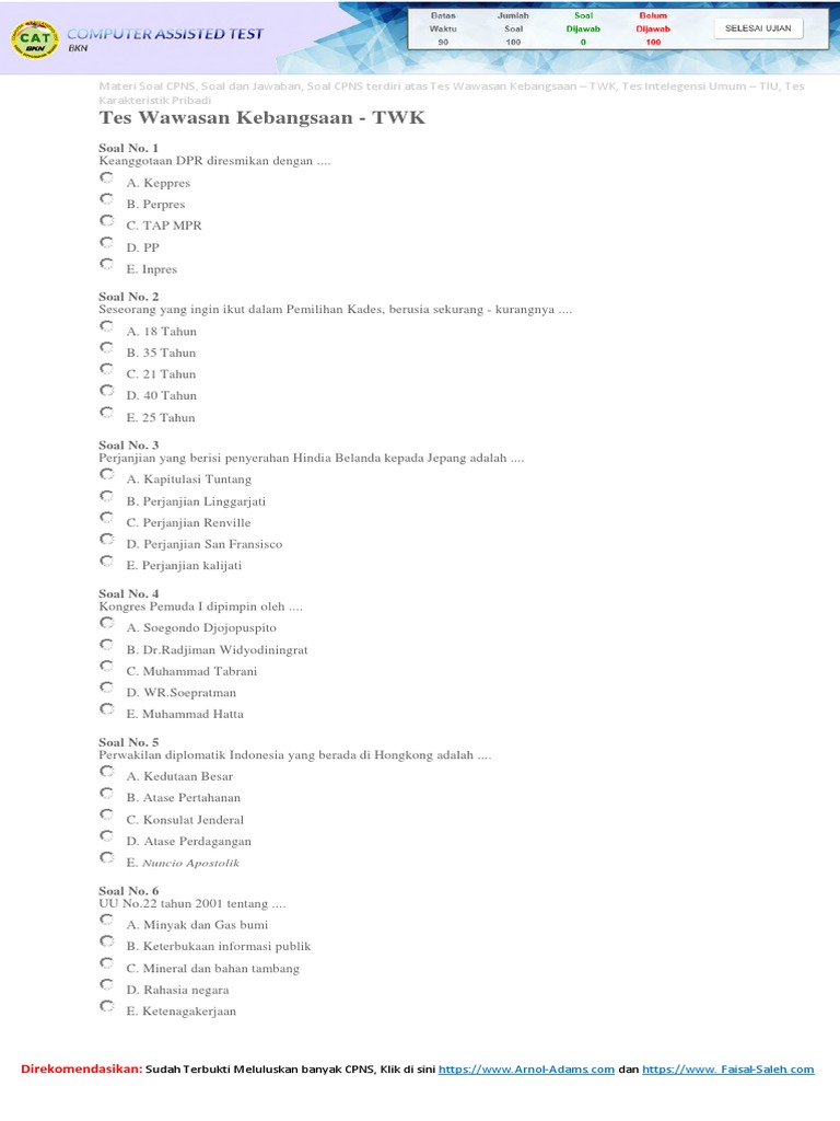 Jumlah soal cat cpns online ini sebanyak 100 soal dengan katagori. Harap kerjakan simulasi berikut dengan serius. Materi tes wawasan kebangsaan twk gratis selamat datang di markijarcom pada kesempatan kali ini kita akan membagikan kumpulan materi tes wawasan kebangsaan twk.