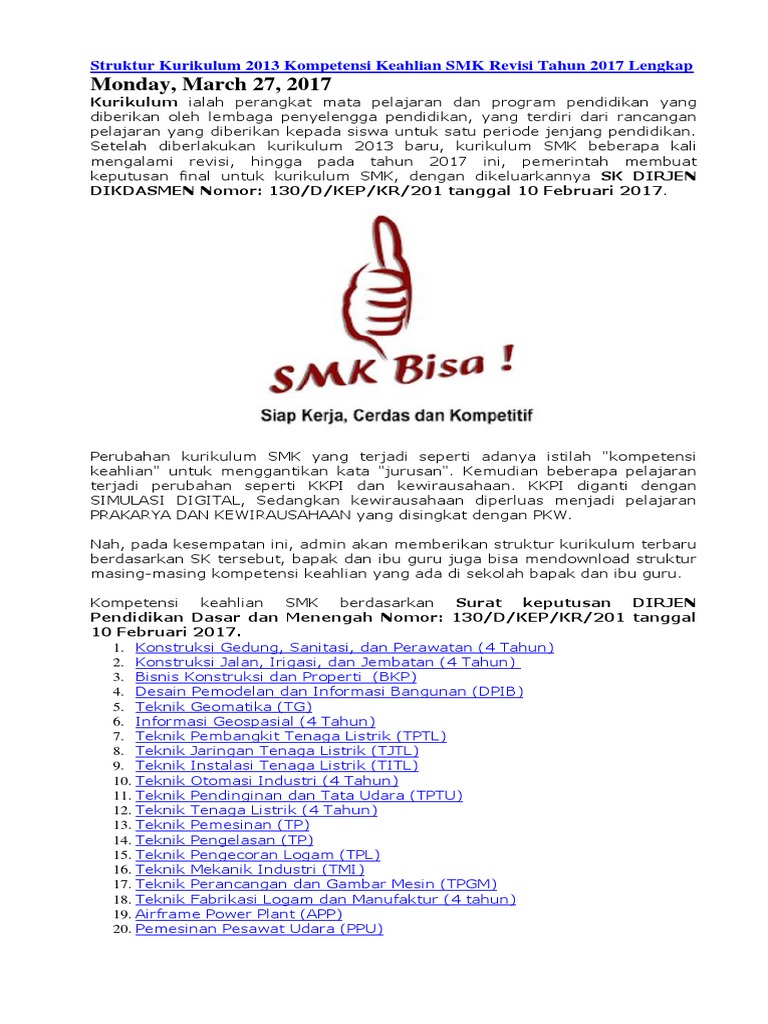 Struktur Kurikulum 2013 Smk Tahun 2017 Menurut Sk Dirjen Dikdasmen
