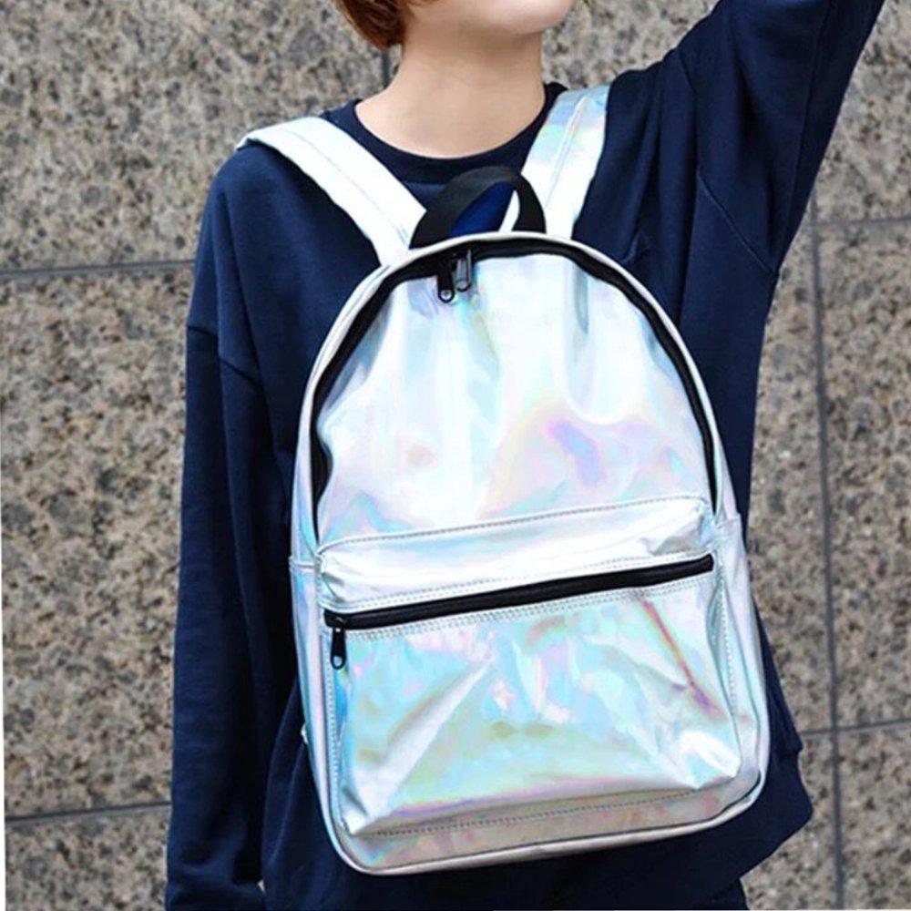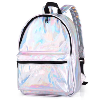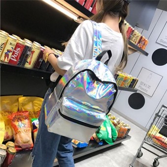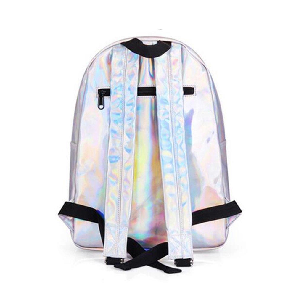 Wanita Perak Hologram Hologram Laser Backpack Tas Sekolah Pu Kulit