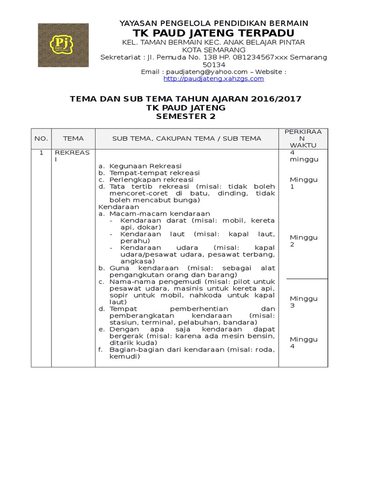Contoh Tema Dan Sub Tema Semester 2 Paud Tk Kb Tpa Paud Jateng