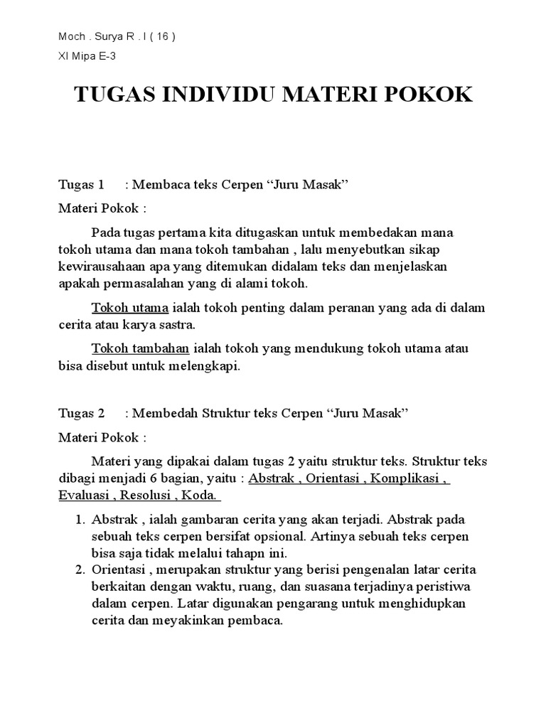 Pertanyaan Dari Cerpen Juru Masak Bahasa Indonesia Semester I Kurikul