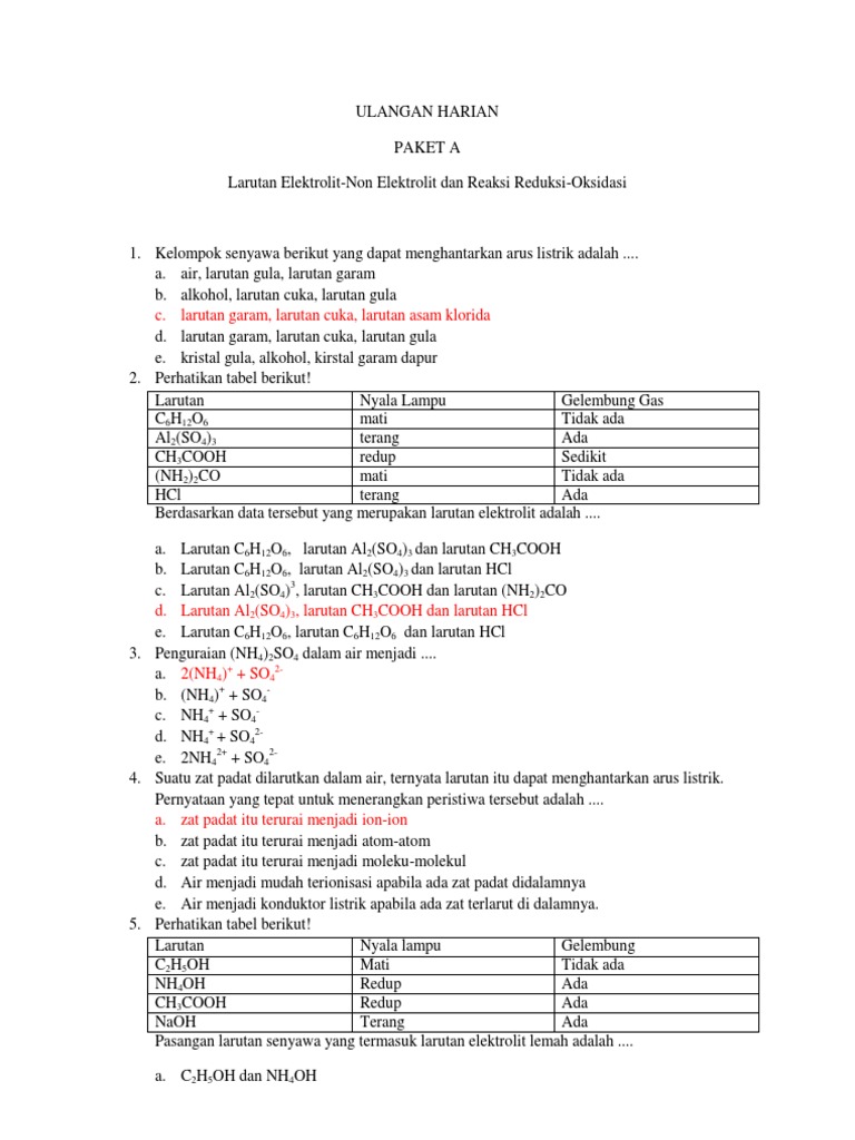 Kumpulan Soal Ulangan Larutan Elektrolit Redoks Tata Nama Beserta
