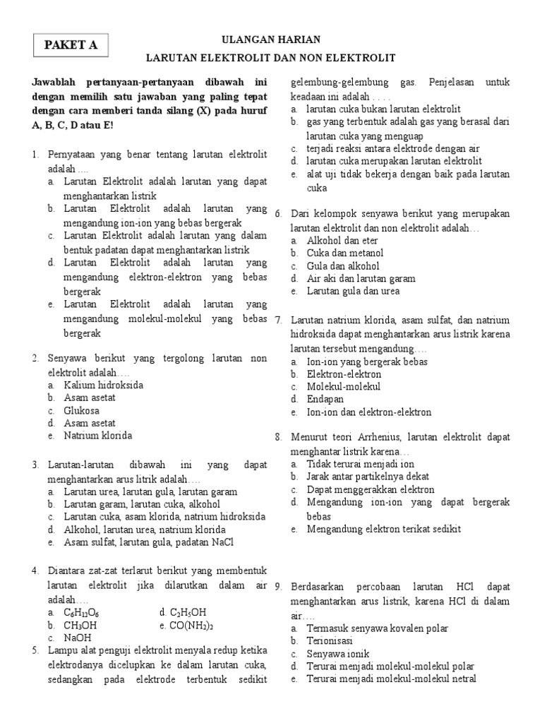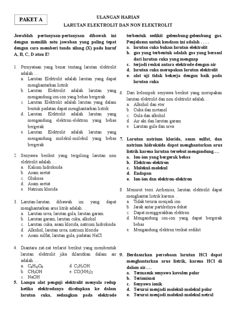 Soal Kimia Kelas 10 Sma Bab Larutan Elektrolit Dan Non Elektrolit