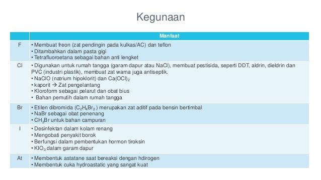 Fluor f klor cl brom br yodium iastatin. Kelompok ini terdiri dari. Thanxs udah berkunjung jangan lupa mampir lagi ya.