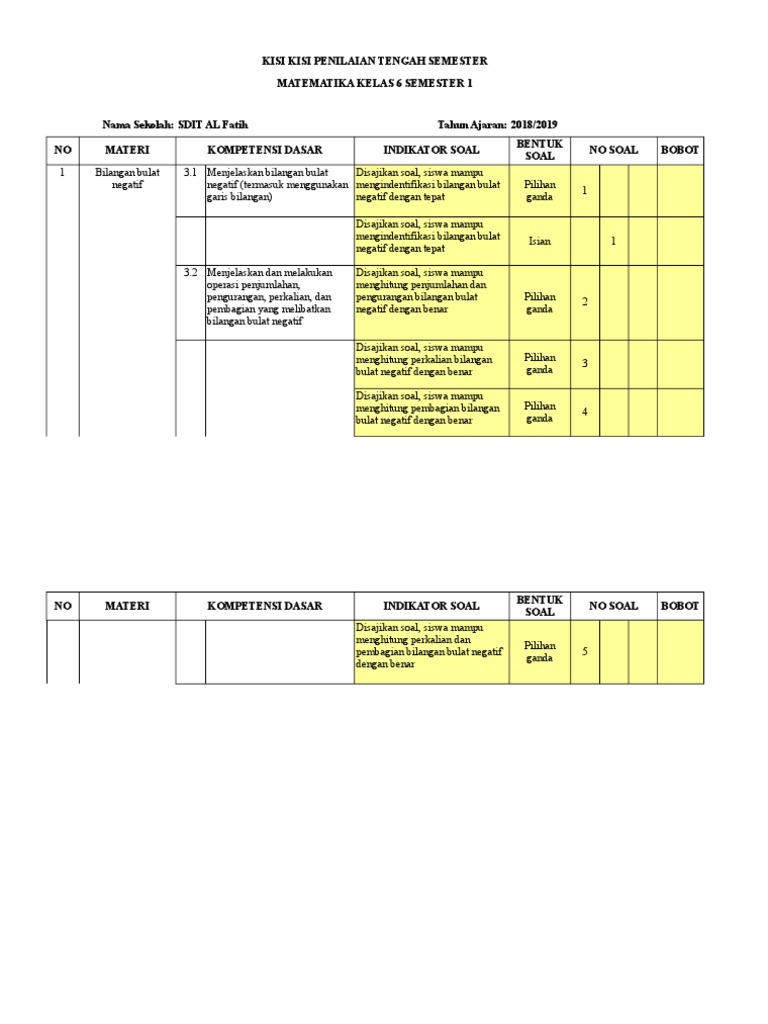 Copy Of Kisi Kisi Pts Matematika 6a K 13