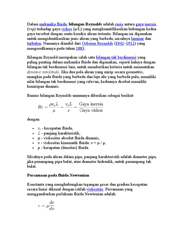 Namanya diambil dari osborne reynolds 18421912 yang mengusulkannya pada tahun 1883. Dalam mekanika fluida bilangan reynolds adalah rasio antara gaya inersia vsr terhadap gaya viskos ml yang mengkuantifikasikan hubungan kedua gaya tersebut dengan suatu kondisi aliran tertentu. Namanya diambil dari osborne reynolds 18421912 yang mengusulkannya pada tahun 1883.