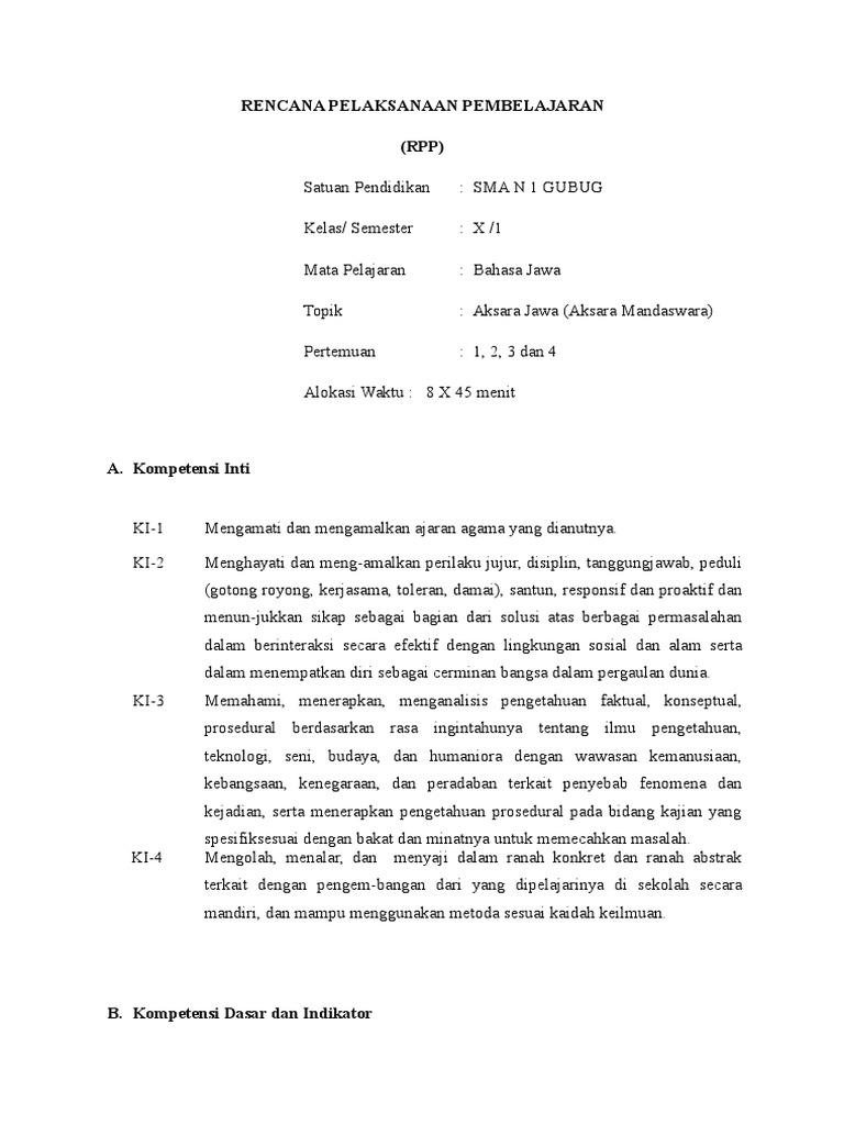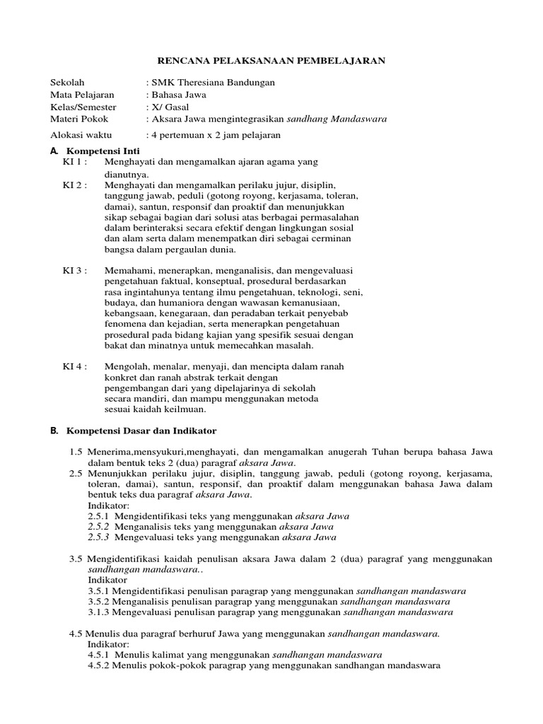 Rpp Bahasa Jawa Kelas X Kurikulum 2013 Materi Aksara Jawa Sandhangan Mandaswara Si Pak Guru