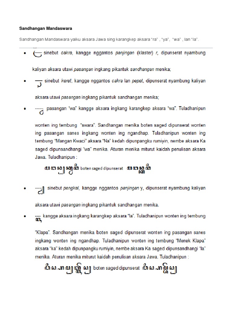Identifikasi lan kaidah nyerat sandhangan mandaswara sandhangan mandaswara yaiku aksara jawa sing karangkep aksara ra ya wa lan la. Sandangan ini digunakan oleh aksara carakan tertentu yang memiliki aturan penulisan sendiri. Wanda menga saburine wanda kang uga menga mawa sandhangan wulu utawa taling kayata.