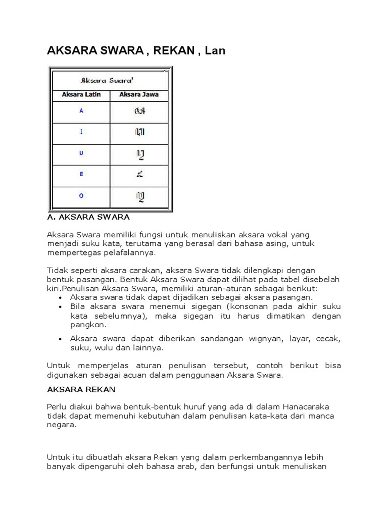 Aksara Swara Viewaksara Swaraaksara Swara Gunane Kanggo Nulis Swara Kang Dadi Wanda Ing Tembung Utamane Tembung Manca Asing Kanggo Nyeethakake Memperjelas Cara Nulis Aksara Swara Docx Document