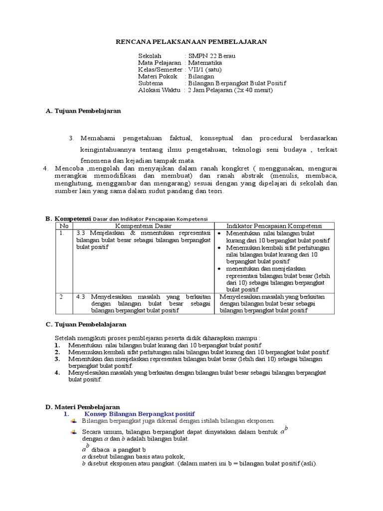 Rpp Kd 3 3 Bilangan Berpangkat Kelas 7 Smp K13
