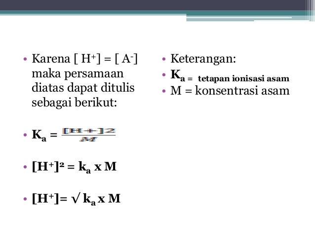 Derajat Ionisasi dan Hubungannya dengan Ka dan Kb - Your ... from latex.codecogs.com Asam dari yang paling lemah ke yang paling kuat (ka kecil ke ka besar). Didefinisikan bahwa asam adalah zat yang dapat menyumbangkan proton (h+ ) kepada zat lain, sedangkan basa didefinisikan sebagai zat yang dapat menerima proton (h+ ) dari asam. Oleh karena itu, harga ka merupakan ukuran.