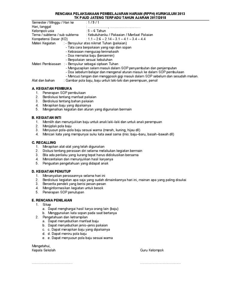Rpph Tk B Smt1 Minggu 09 Pakaian 1