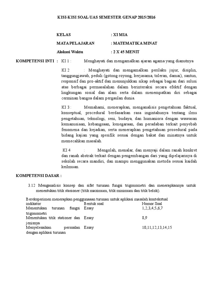 Kisi Kisi Uts Genap Matematika Kelas Xi Docx