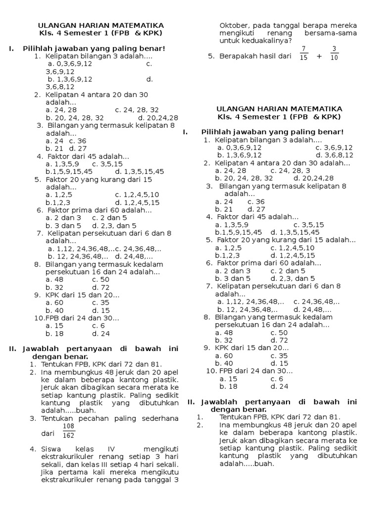 Soal Mtk Kelas 4 Semester 2 Kpk Dan Fpb Serta Kunci Jawabannya