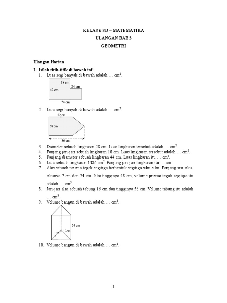 Soal Matematika Kelas 6 Sd Semester I Ulangan Bab 3 Geometri