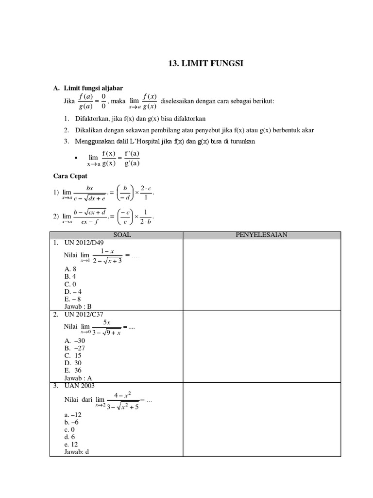Soal Dan Pembahasan Super Lengkap Limit Fungsi Aljabar