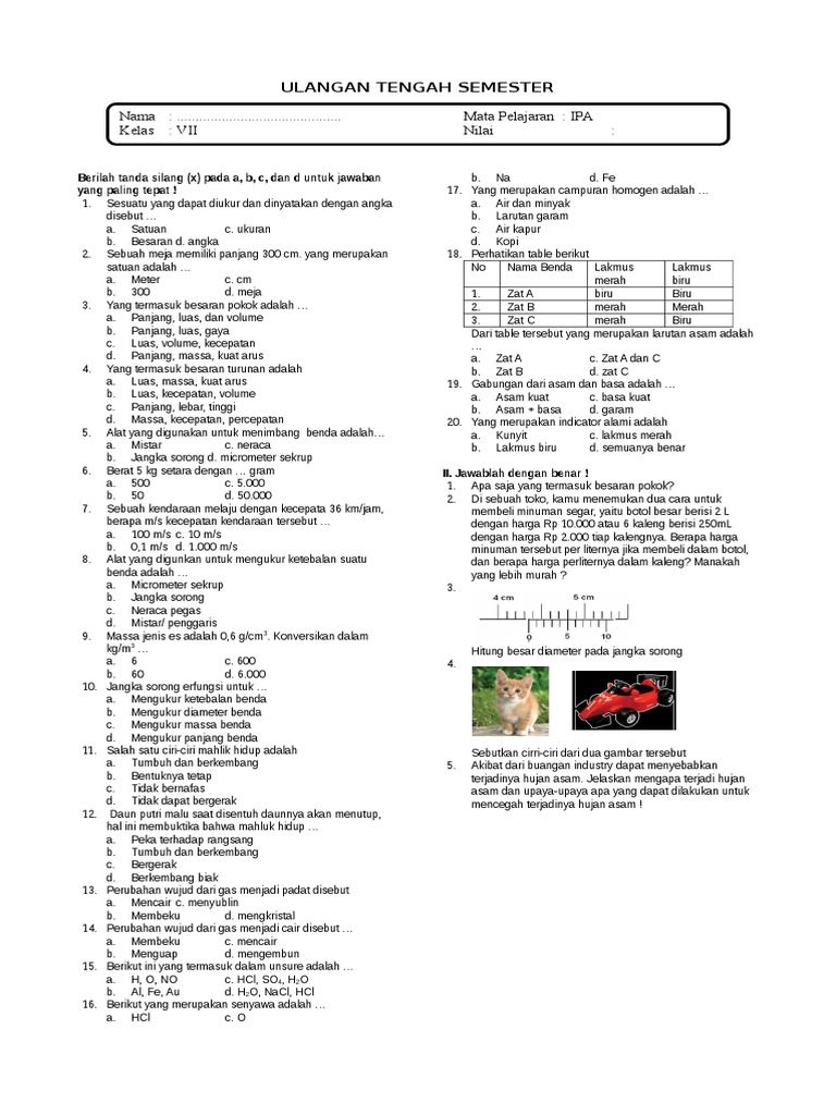 Ulangan Tengah Semester Nama Mata Pelajaran Ipa Kelas Vii Nilai