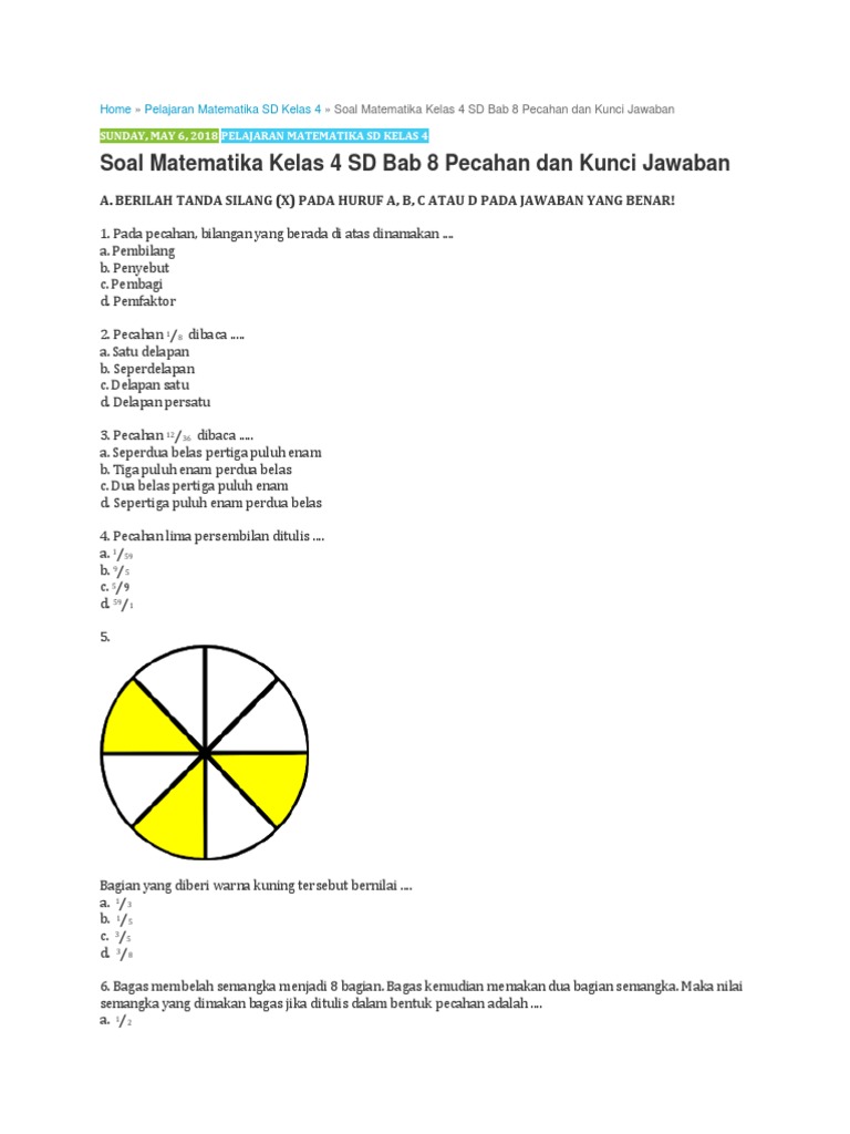 Soal Matematika Kelas 4 Sd Bab 8 Pecahan Dan Kunci Jawaban