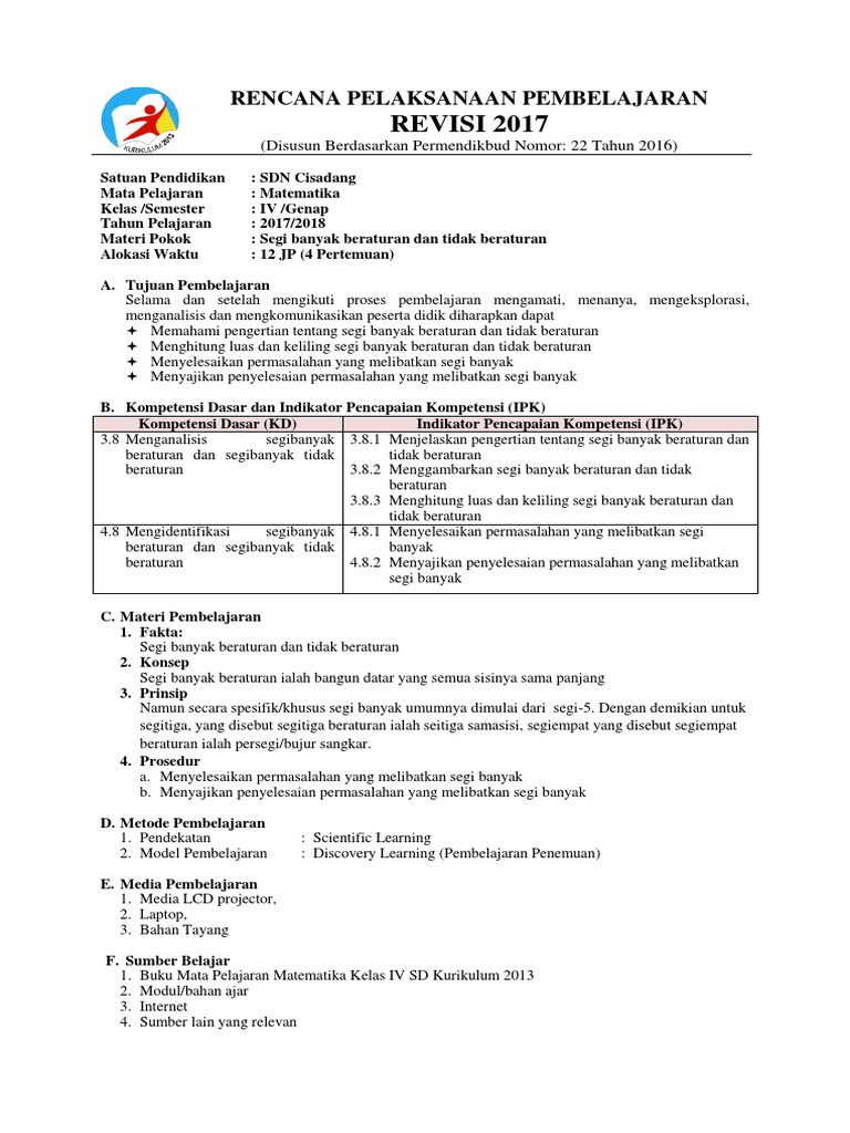 Rpp Matematika Kelas 4 Semester 1 Dan 2 Kurikulum 2013 Revisi 2018 Materiku