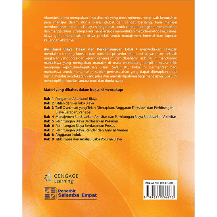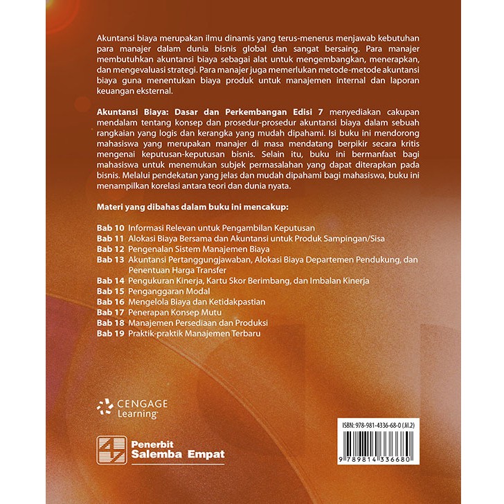 Bahasa yang sederhana dan sistematis dilengkapi oleh contoh dan soal ilustrasi membuat penjelasan materi dalam buku ini mudah dipahami oleh mahasiswa. Selain membahas pengertian biaya dan berbagai cara klasifikasi informasi biaya buku akuntansi biaya ini juga membahas berbagai cara akumulasi biaya produksi yang cocok diterapkan sesuai dengan karakteristik produksi perusahaan.