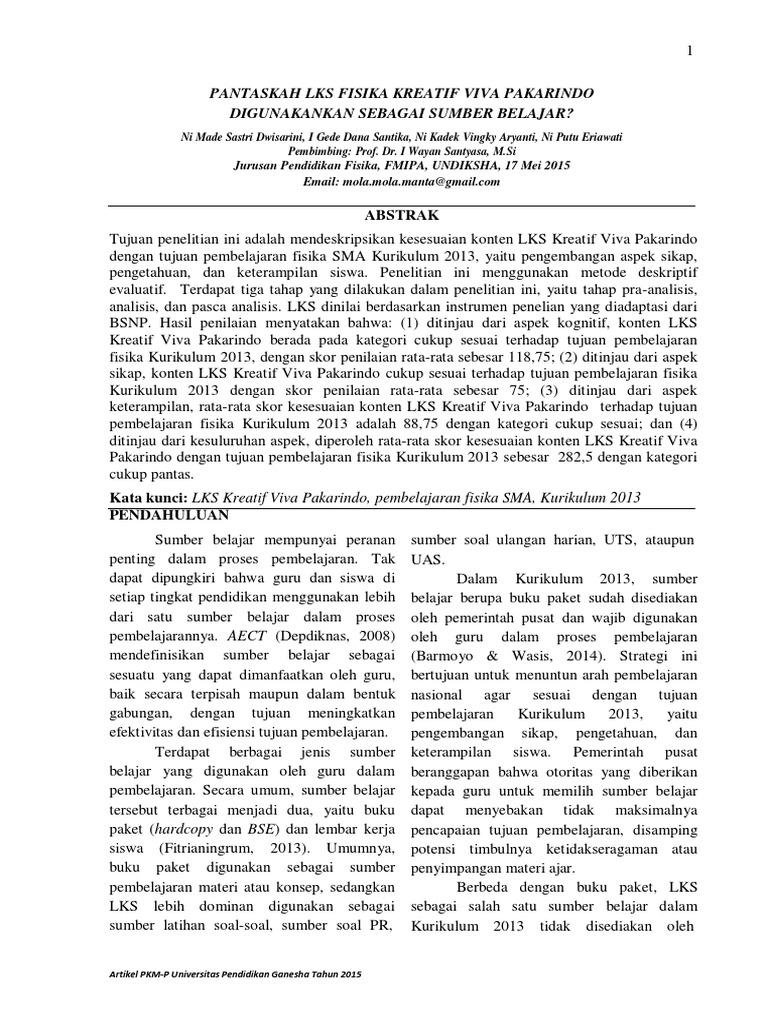 Pdf Pantaskah Lks Fisika Kreatif Viva Pakarindo Digunakankan Sebagai Sumber Belajar Analisis Kesesuaian Konten Lks Fisika Sma Kreatif Viva Pakarindo Di Kota Singaraja Terhadap Tujuan Pembelajaran Kurikulum 2013 I Gede Dana