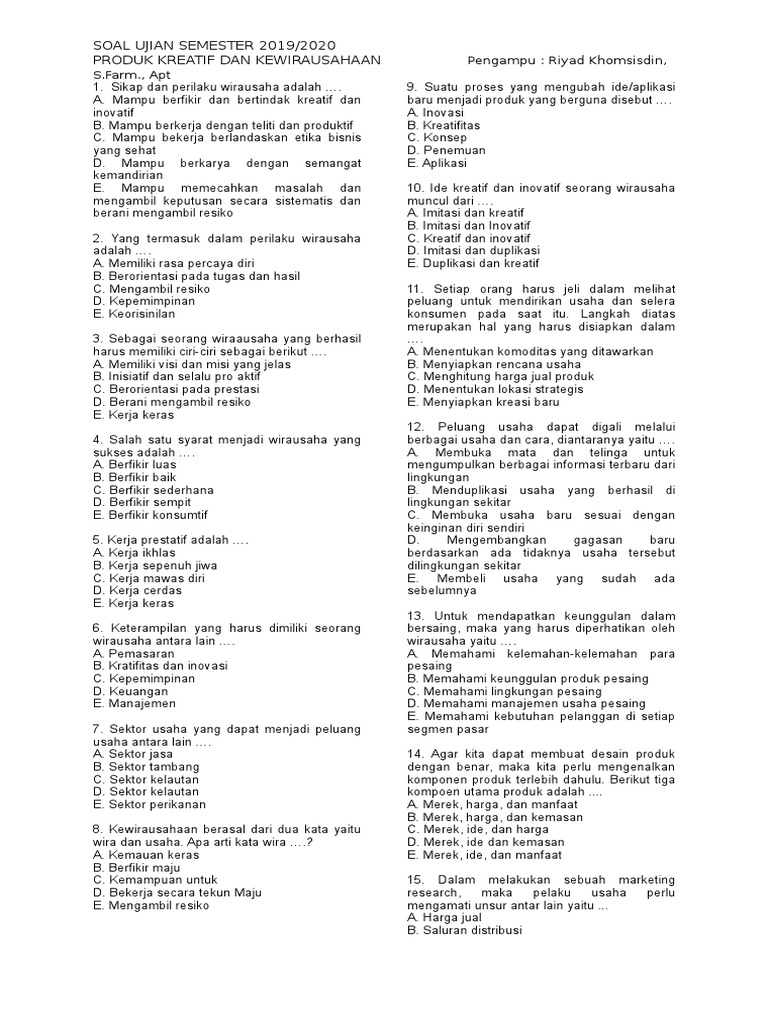 Soal Produk Kreatif Dan Kewirausahaan Farmasi