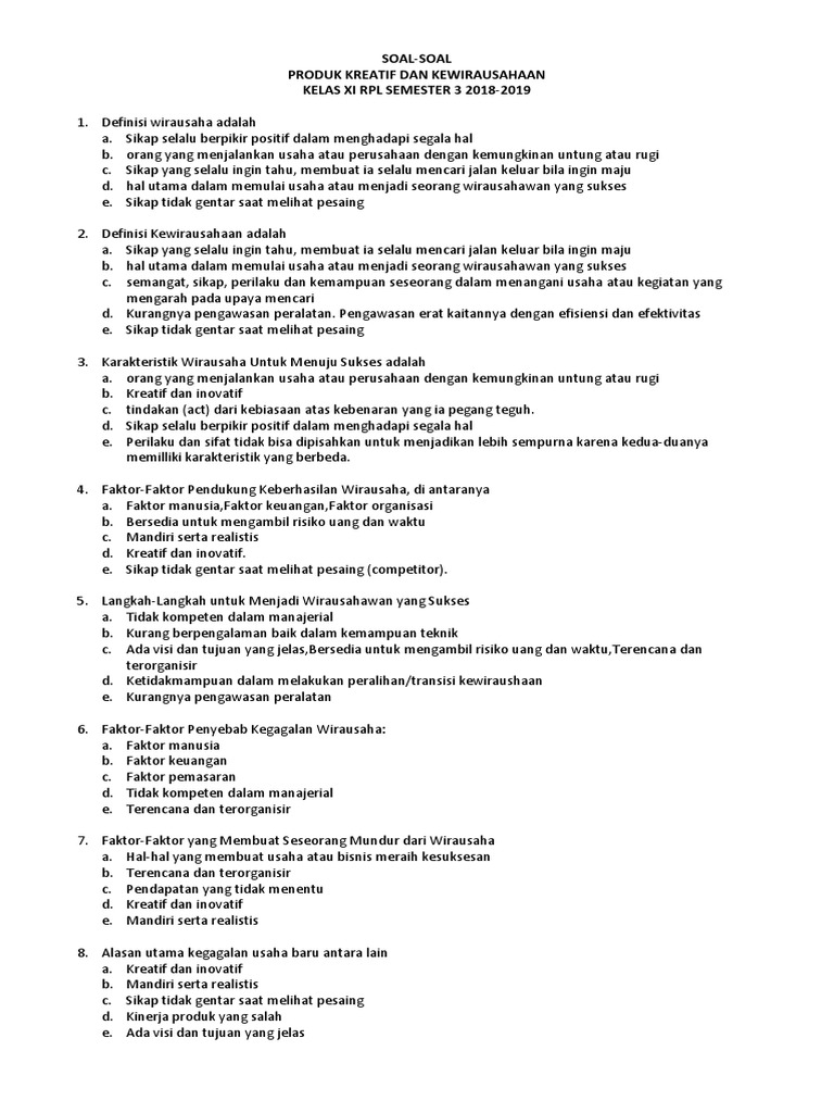 Contoh soal dan jawaban produk kreatif dan kewirausahaan kelas 12. Produk kreatif dan kewirausahaan kompetensi keahlian. Pengertian kewirausahaan secara umum ialah proses penciptaan dalam mengerjakan usaha baru atau kreatif dan berbeda inovatif yang bermanfaat untuk memberikan nilai lebihberikut saya bagikan makalah produk kreatif kewirausahaan proposal membuat gedang krispi.