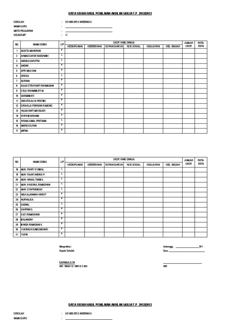 Format Rekapitulasi Penilaian Ahlak Kepribadian Siswa Kurikulum 2013 Postedukasi Com