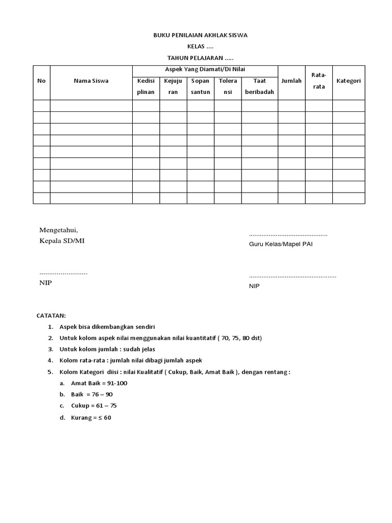 Contoh Format Penilaian Akhlak Dan Kepribadian Siswa Sd Cute766