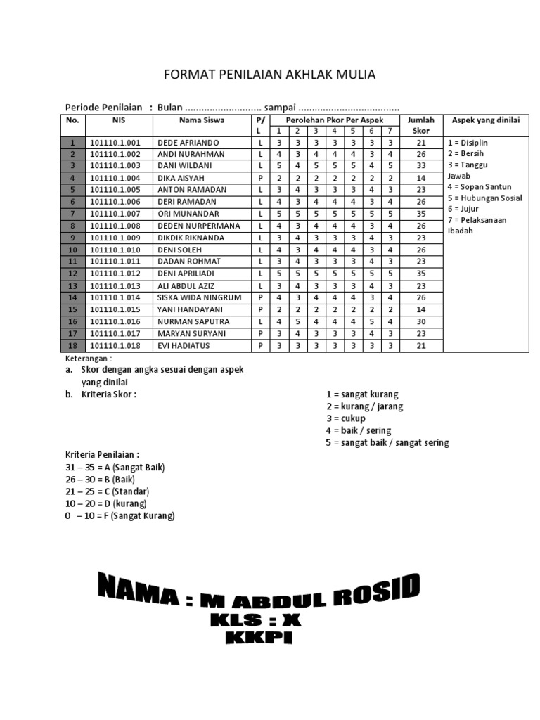 Contoh Format Penilaian Akhlak Mulia