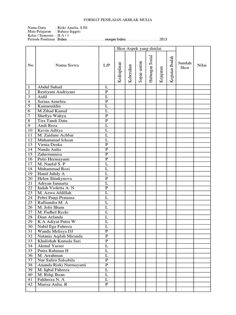 Contoh Format Penilaian Akhlak Mulia Siswa Penilaian Agama