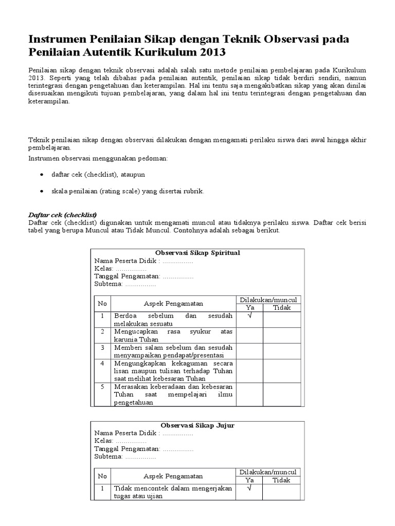 Instrumen Penilaian Sikap Dengan Teknik Observasi Pada Penilaian Autentik Kurikulum 2013