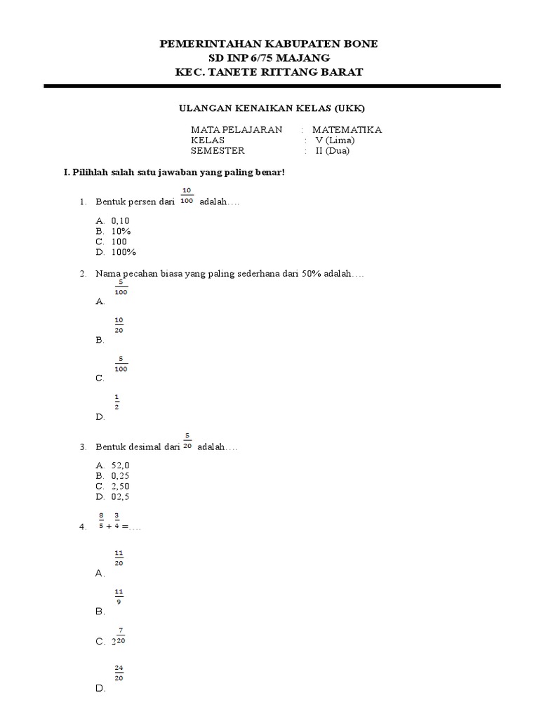 5 Soal Ukk Matematika Kelas 5 2013
