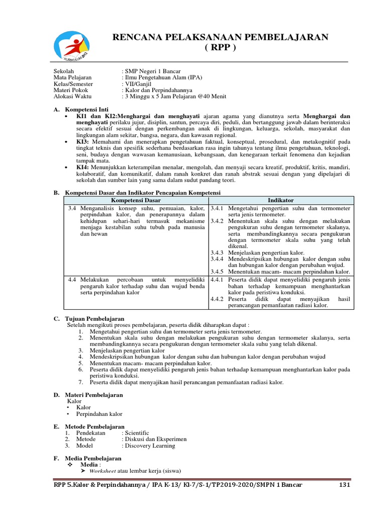 Rpp 5 Ipa K13 Kelas 7 Semester 1 Bab 5 Kalor Dan Perpindahannya