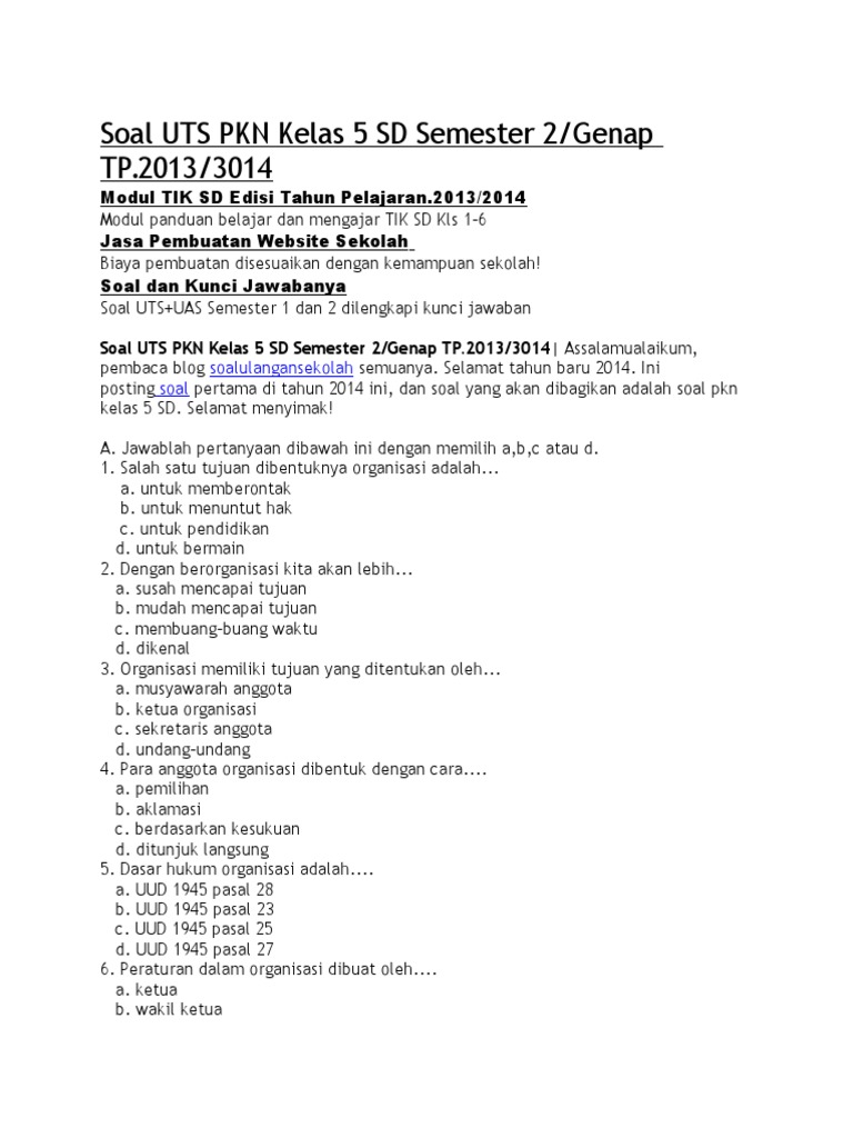Soal Uts Pkn Kelas 5 Sd Semester 2