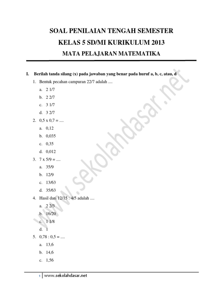 Soal Penilaian Tengah Semester 1 Matematika Kelas 5 K 13 Sekolahdasar Net