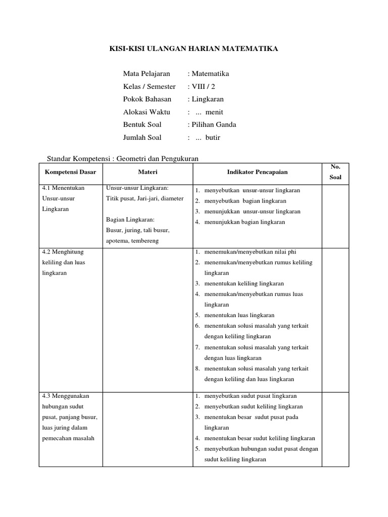 Kisi Kisi Soal Ulangan Harian Matematika Kelas 6 Semester 1 Unsur Lingkaran Antapedia Com