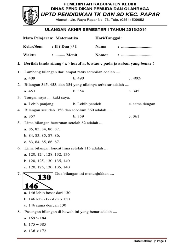 Soal Matematika Kelas 2 Sd Semester 1 Lengkap Administrasi Sekolah Kelas 24