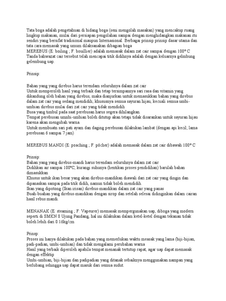 Pengertian tata boga tata boga adalah pengetahuan di bidang boga seni mengolah makanan yang mencakup ruang lingkup makanan mulai dari persiapan pengolahan hingga menghidangkan makanan yang bersifat tradisional maupun internasional. Tata boga adalah pengetahuan di bidang boga seni mengolah masakan yang mencakup ruang lingkup makanan mulai. Berbagai prinsip prinsip dasar utama dan tata cara memasak yang umum dilaksanakan dibagian boga merebus e.