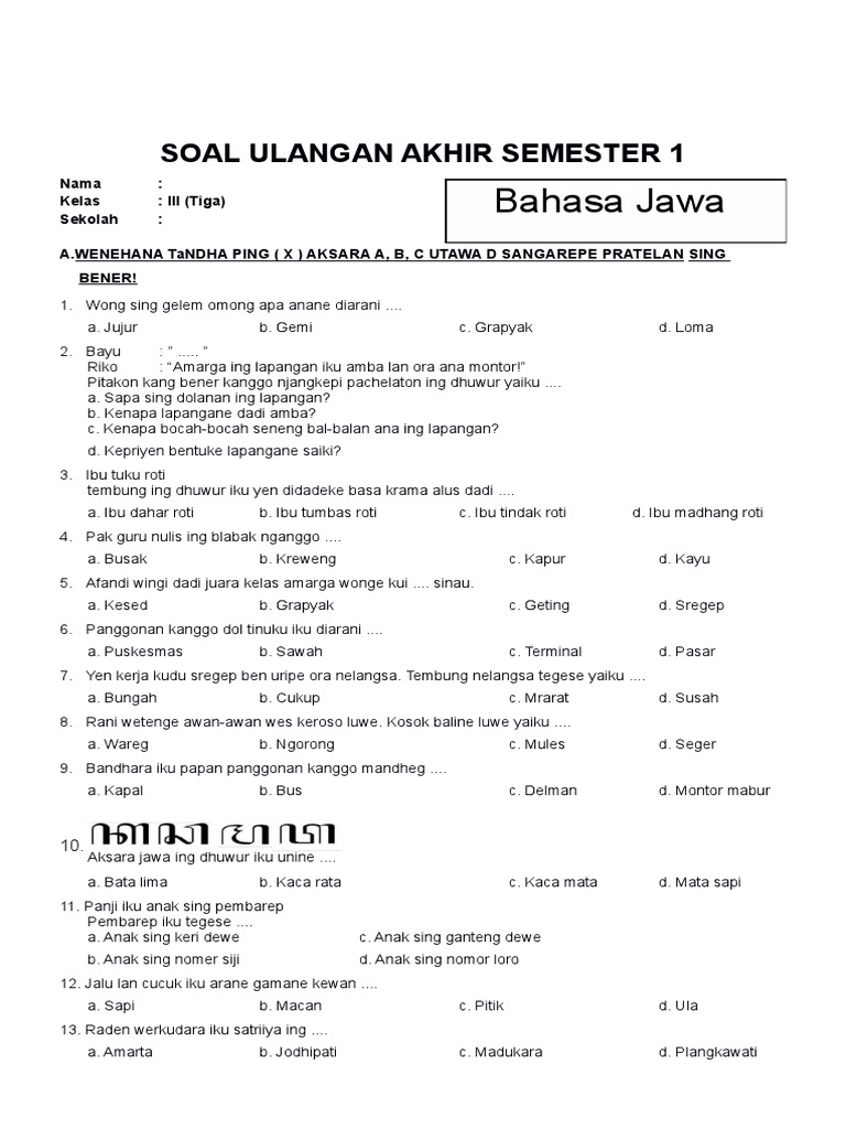 Soal Uas Bahasa Jawa Kelas 3 Sd Semester 1 Ganjil Dan Kunci Jawabannya Www Bimbelbrilian Com