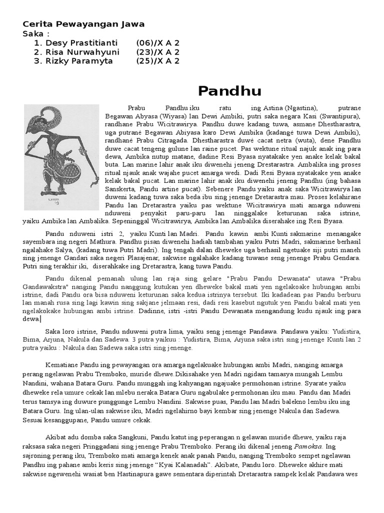 Dalam dunia seni dan dongeng jawa sering mendengar tentang seni pewayangan yang menghasilkan cerita cerita dari beberapa tokoh yang mencerminkan sifat dasar pada diri manusia yaitu tentang pandawa lima dalam cerita cerpen wayang jawa. Kisah para pandawa sangat terkenal di nusantara yang memiliki arti putra pandu dewanegara sang raja hastinapura. Ini menverifikasi pengaturan dalang sebagai orang yang memiliki lebih banyak pemahaman dan menyebarkannya ke penonton pertunjukan wayang.