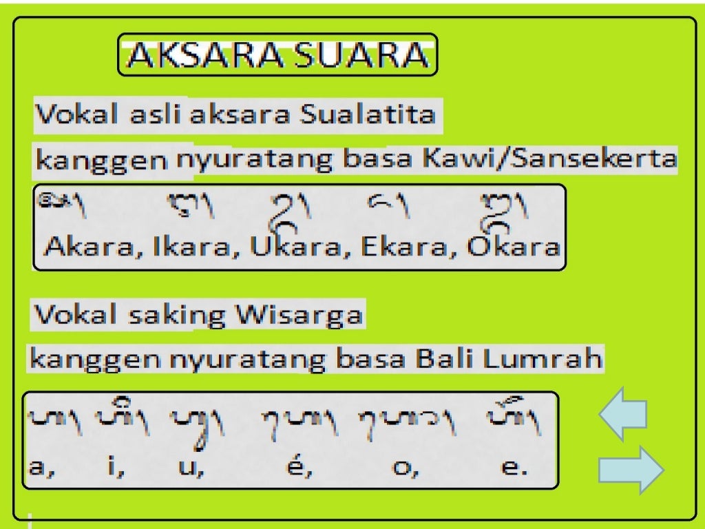 Aksara suarane pateh ring vocal sajeroning bahasa indonesia. Yening kasurat nejajar ipun pinaka wianjana yening kasurat pinaka gantungan ipun pateh kadi suara vokal. Akara ikara ukara ekara okara.