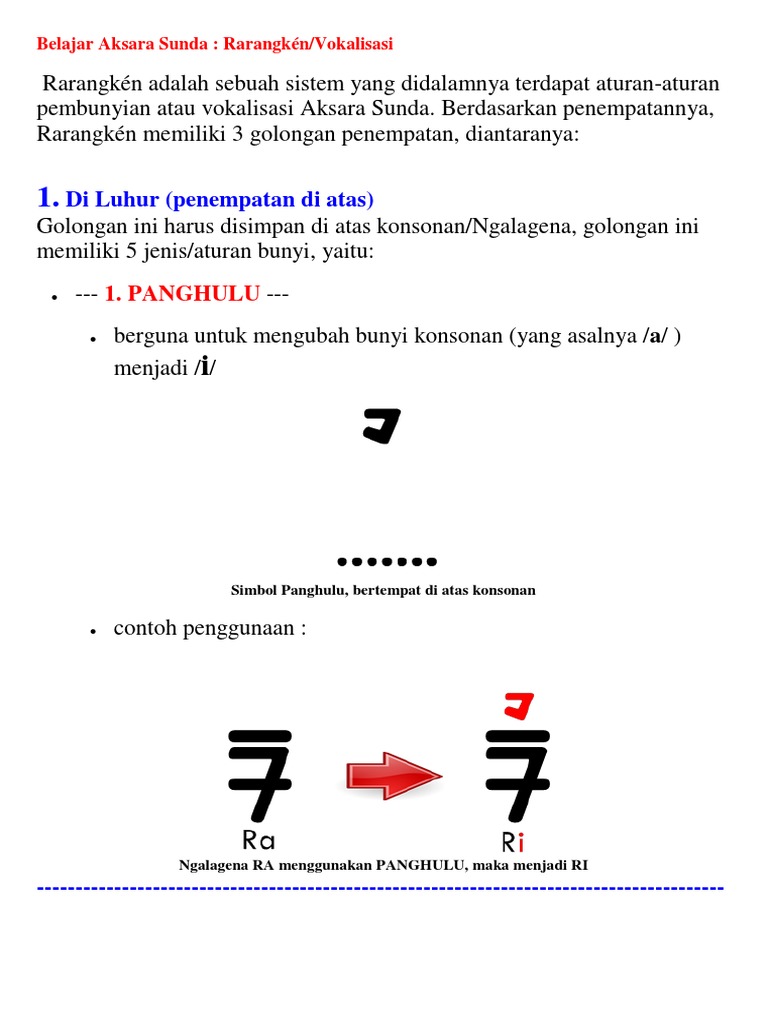 Assalamualaikum wr wb terimakasih sudah berkunjung ke halaman upama maké aksara sunda, unggal aksara ngalagena nu di singget kudu maké rarangkén pamaéh. Materi aksara sunda (part 1) learn sundanese language part 2 there are also rarangkén or attachments for removing, modifying, or adding vowel or consonant. Aksara sunda baku dirancang dan disusun dari hasil perbandingan aksara sunda kuno yang aksara sunda baku yang dipakai sekarang terdiri atas aksara swara, aksara ngalagena, rarangken. Panghulu, membuat vokal aksara ngalagena dari a menjadi i.